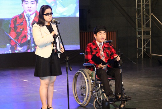 6일 대학로 마로니에 공원에서 열린 ‘2015 장애인문화예술축제’ 개막식에 오른 장애인예술계를 이끌어갈 미래들이 결의에 찬 듯 힘주어 읽어나갔다.